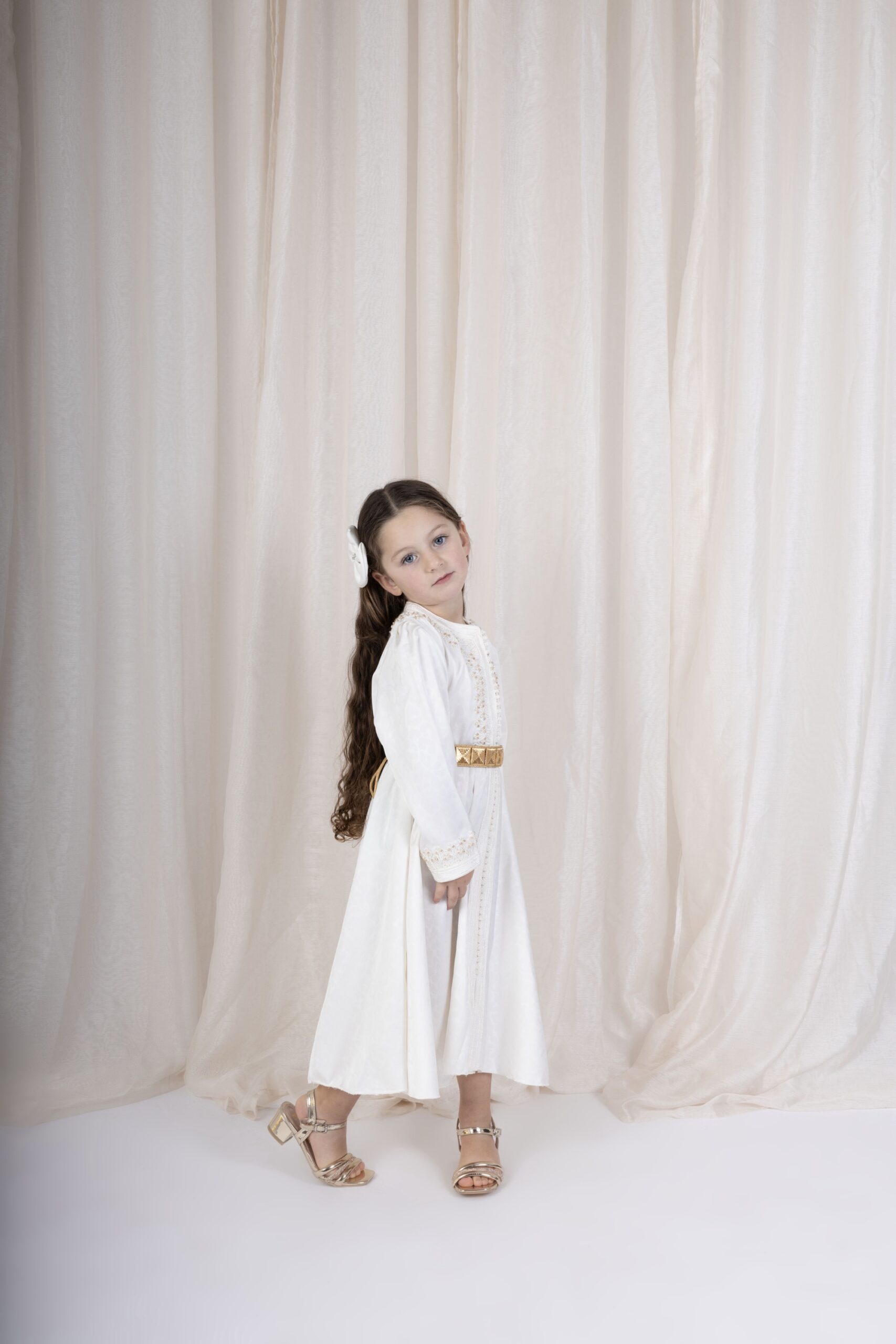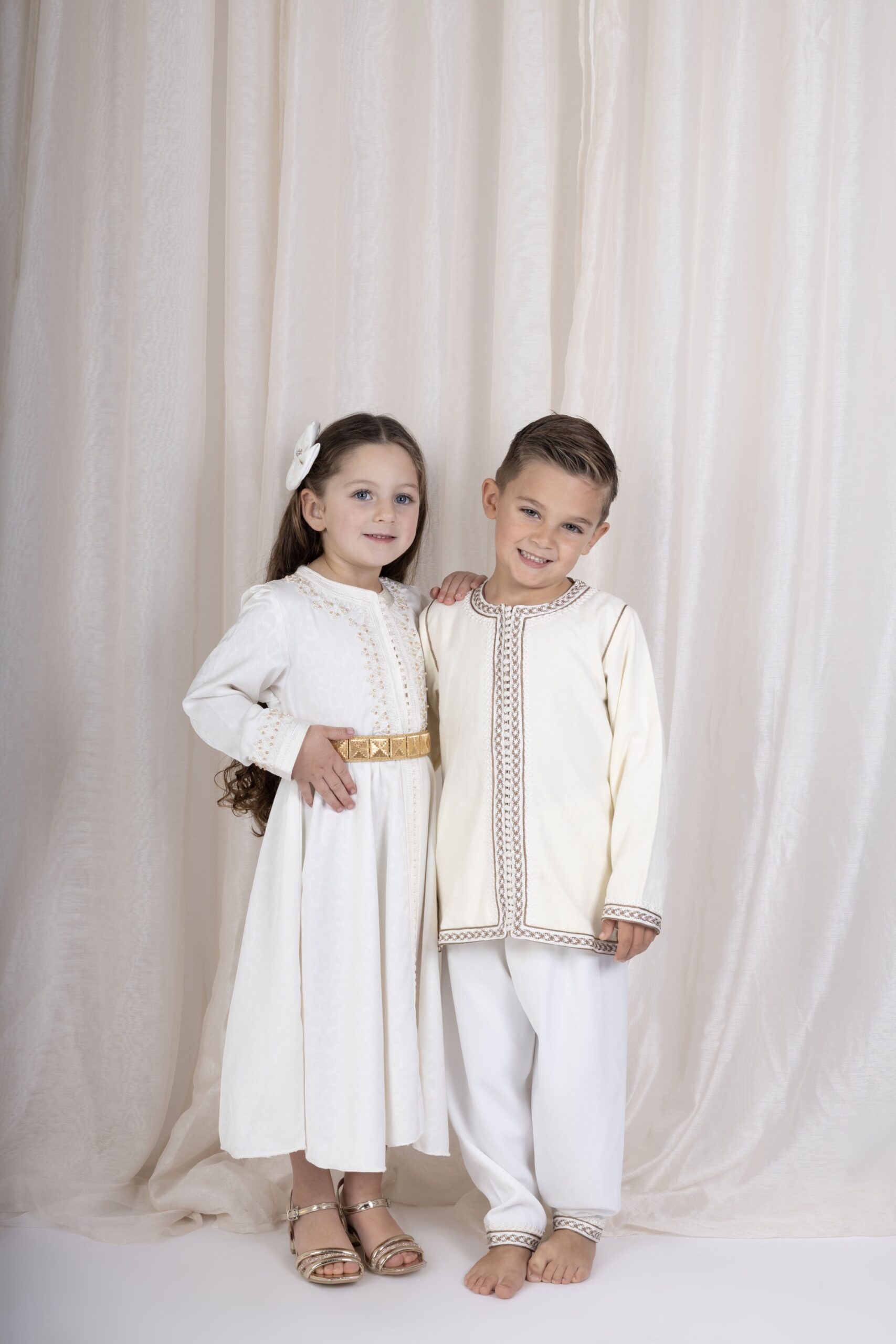 De Caftan Amal Crème is een elegante meisjes caftan in een zachte ecru tint met verfijnde crème borduring. De stof valt soepel en heeft een subtiele jacquardstructuur waardoor de caftan een luxe uitstraling krijgt zonder te opvallend te zijn.
