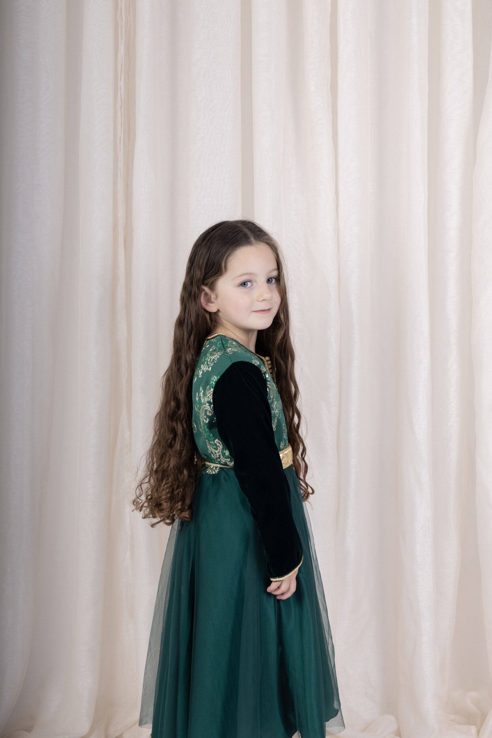 De Noura Emerald Mini is een prachtige meisjes caftan, speciaal ontworpen om aan te sluiten bij de luxe uitstraling van de damesversie. De caftan heeft een elegante groene rok van zachte tule die speels meebeweegt bij elke stap. De bovenkant is gemaakt van rijk velvet in diepe smaragdgroen, afgewerkt met verfijnde goudkleurige details die meteen een feestelijke en chique look geven.