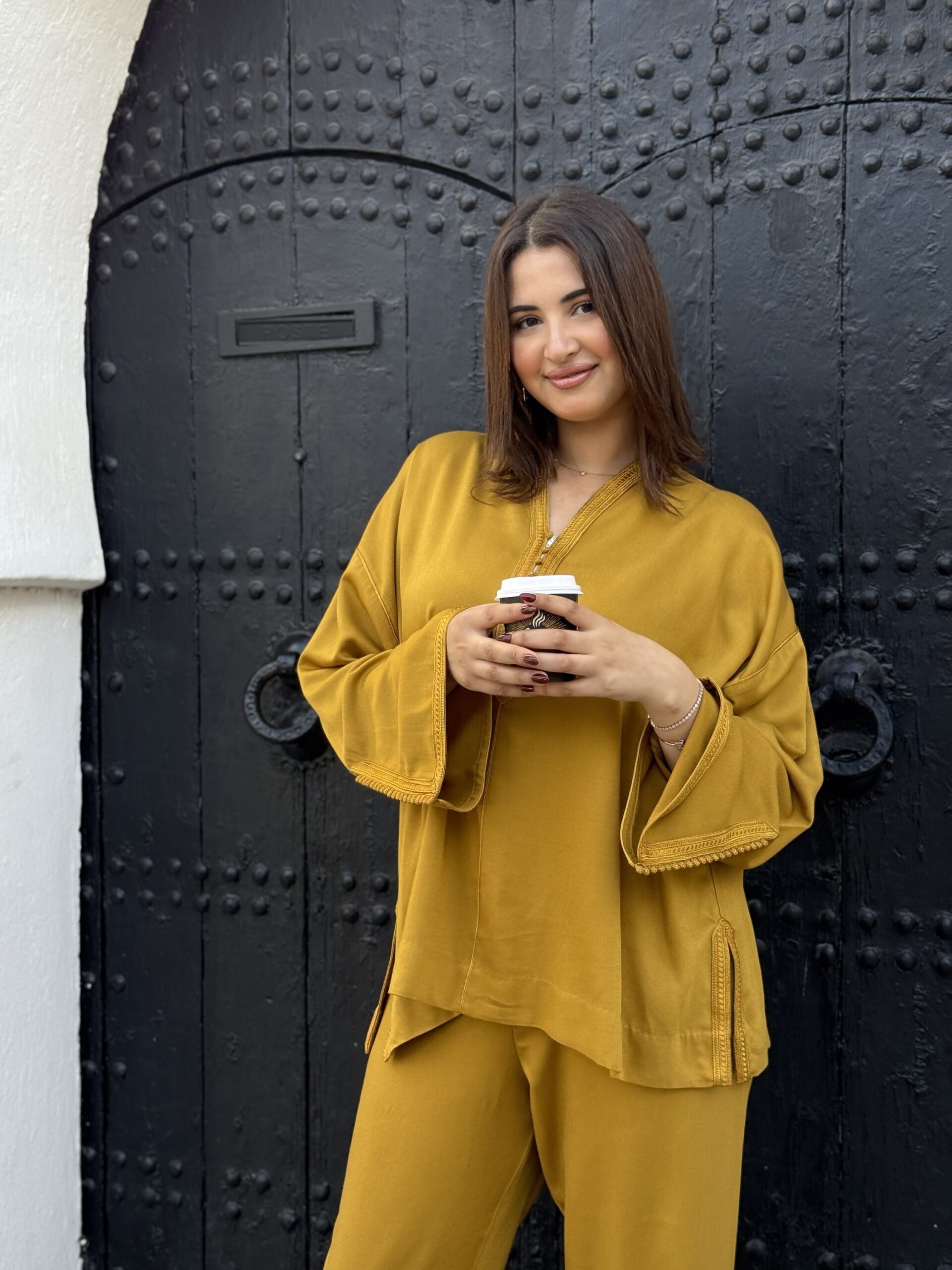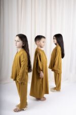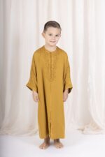 De Candora Marwan Mosterd is een stijlvolle jongens candora in een warme mosterdtint. De stof voelt zacht en luchtig aan, waardoor je zoon zich vrij kan bewegen en de hele dag comfortabel blijft. De verfijnde sfifa en borduring in dezelfde mosterdkleur geven deze look een rustige, elegante uitstraling.