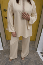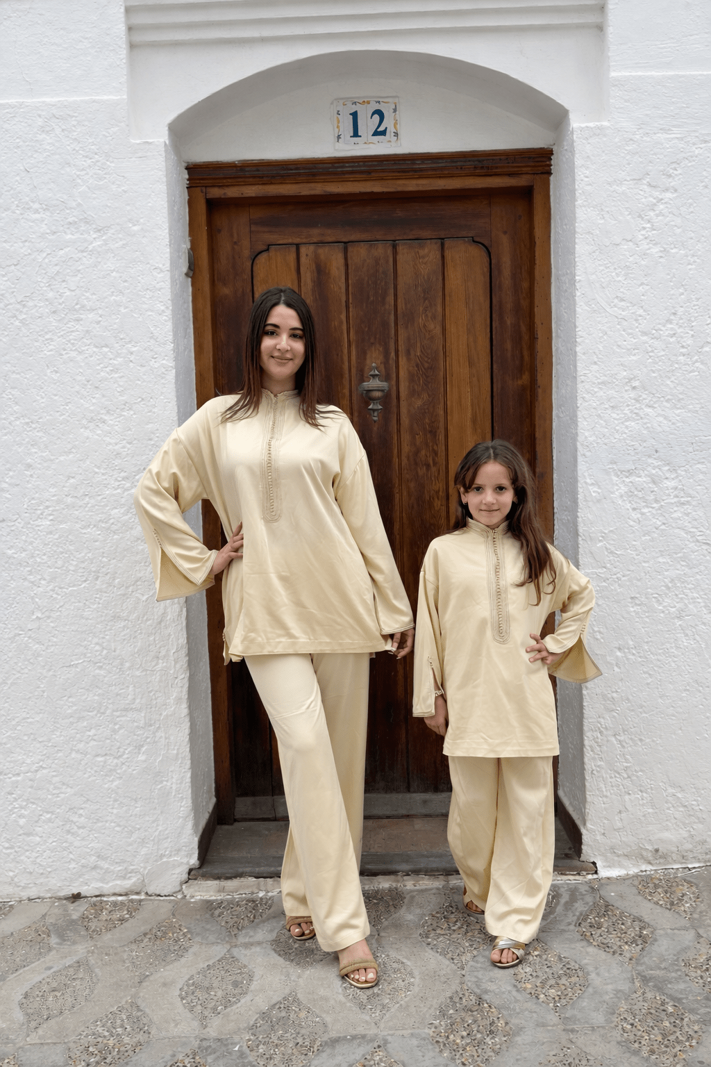 De Aya Jabador Set – Desert Cream is een elegante, handgemaakte Marokkaanse jabador in een zachte beige tint die rust en verfijning uitstraalt. Deze tweedelige set is ontworpen voor zowel dames als meisjes en perfect voor een stijlvolle matching moeder en dochter look.