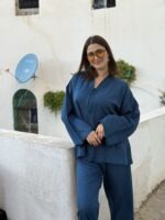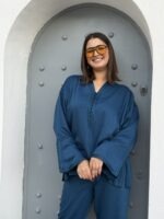 Laila is een moderne jabador set in een rijke petrol blauwe tint die veel vrouwen prachtig staat. De zachte en luchtige stof zorgt voor een comfortabele pasvorm terwijl de klassieke Marokkaanse lijnen zichtbaar blijven. Perfect als nette outfit voor familiebezoek, etentjes of religieuze gelegenheden. Ambachtelijk handgemaakt in Marokko.
