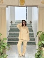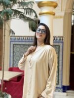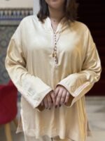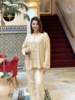 Salma is een rustige en neutrale jabador set in een zachte beige tint. De lichte stof valt soepel en is perfect voor dagelijks gebruik, bezoekmomenten of een nette dag buiten. De set combineert een minimalistische stijl met traditionele Marokkaanse details. Gemaakt met zorg door vakvrouwen in Marokko.