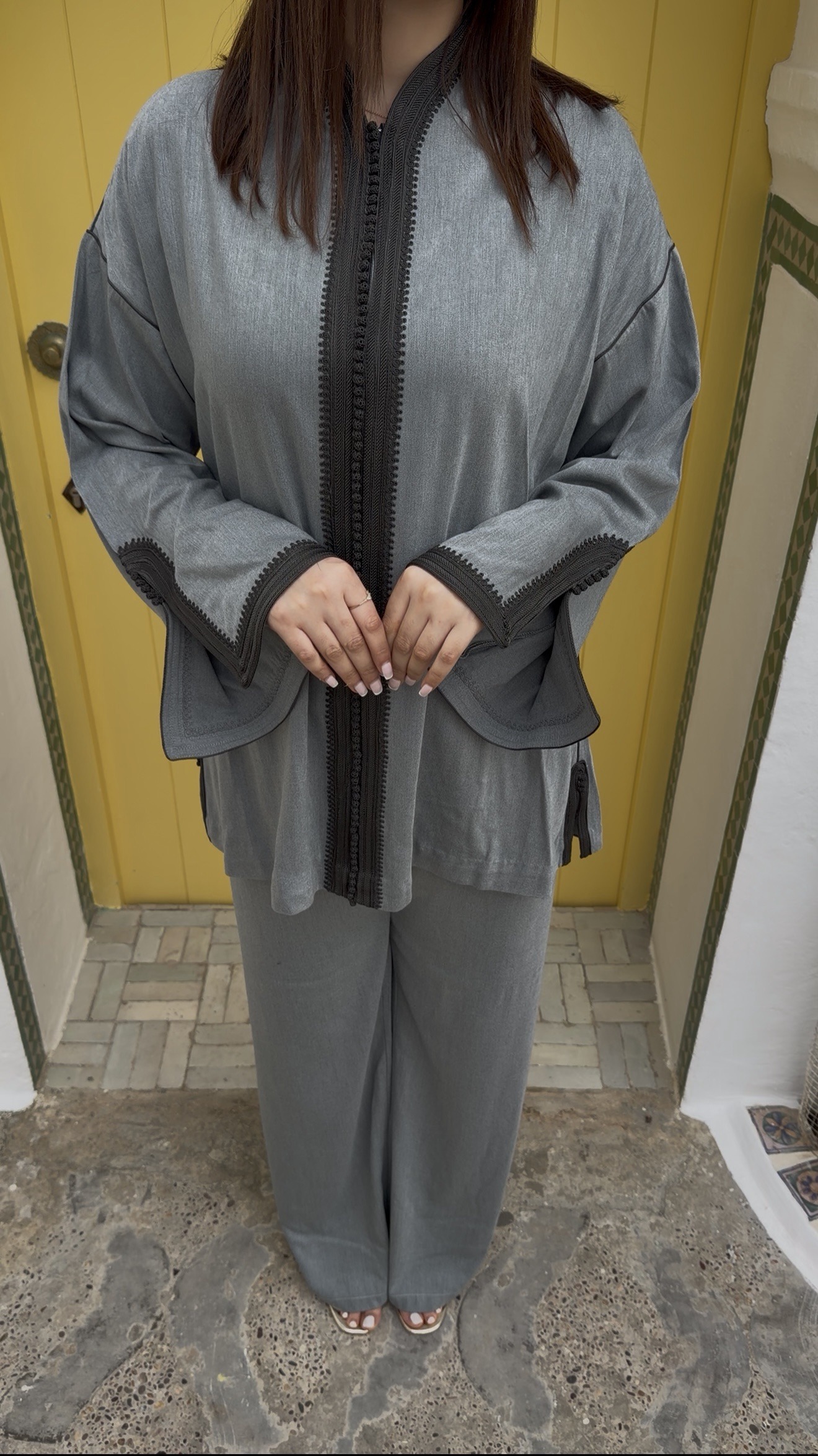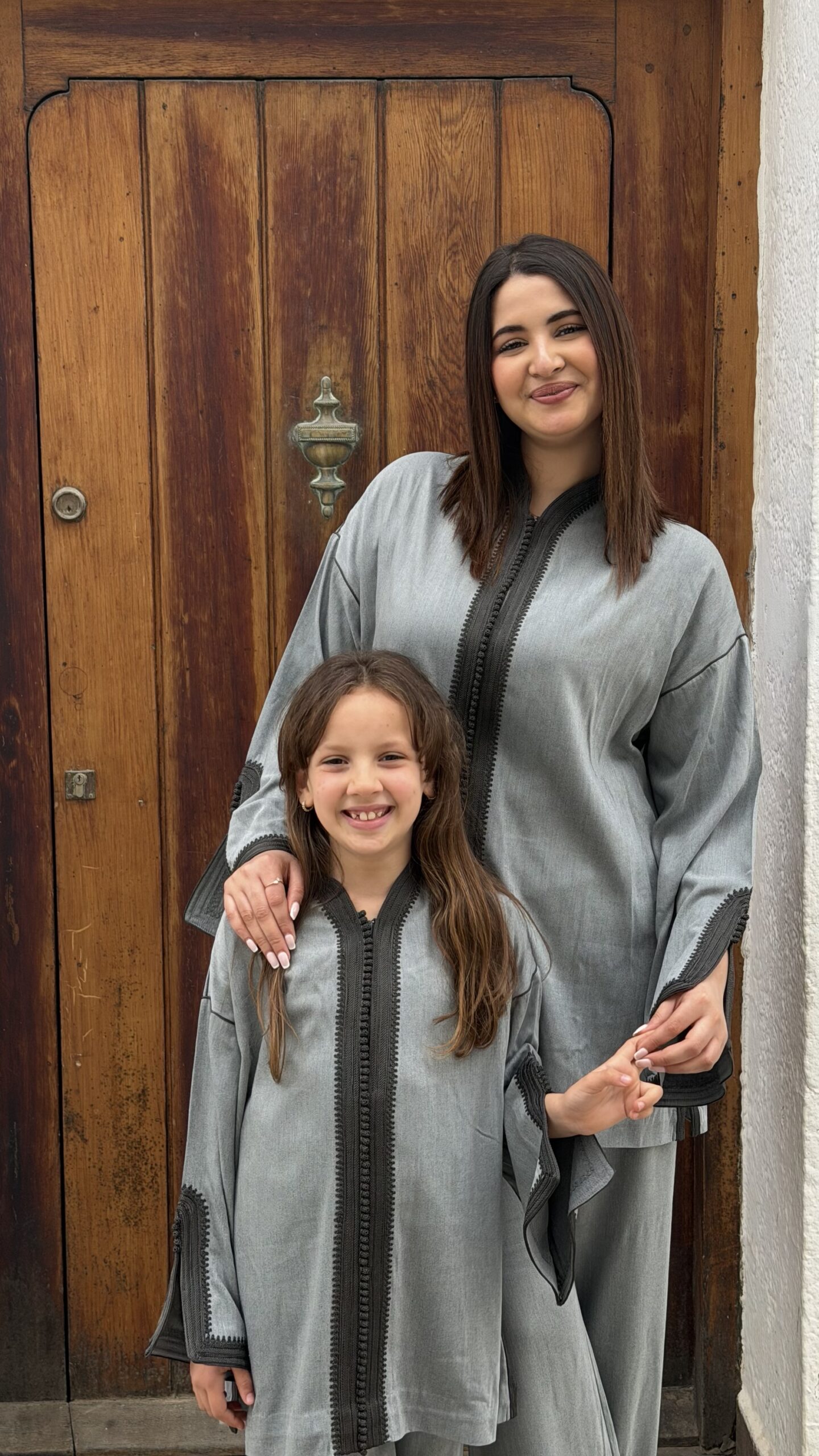 De Sofia Jabador Set – Storm Grey is een stijlvolle, handgemaakte Marokkaanse jabador in een elegante grijstint met verfijnde donkere details. Deze tweedelige set is ontworpen voor zowel dames als meisjes en perfect voor een moderne, matching moeder en dochter look.