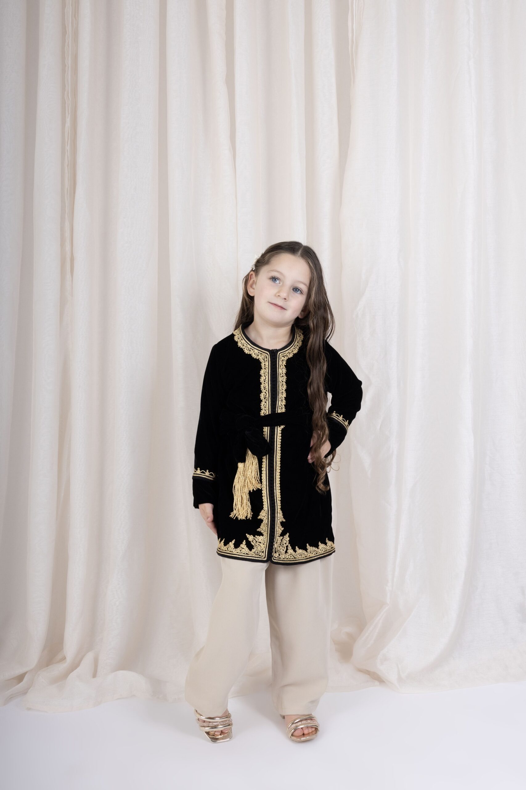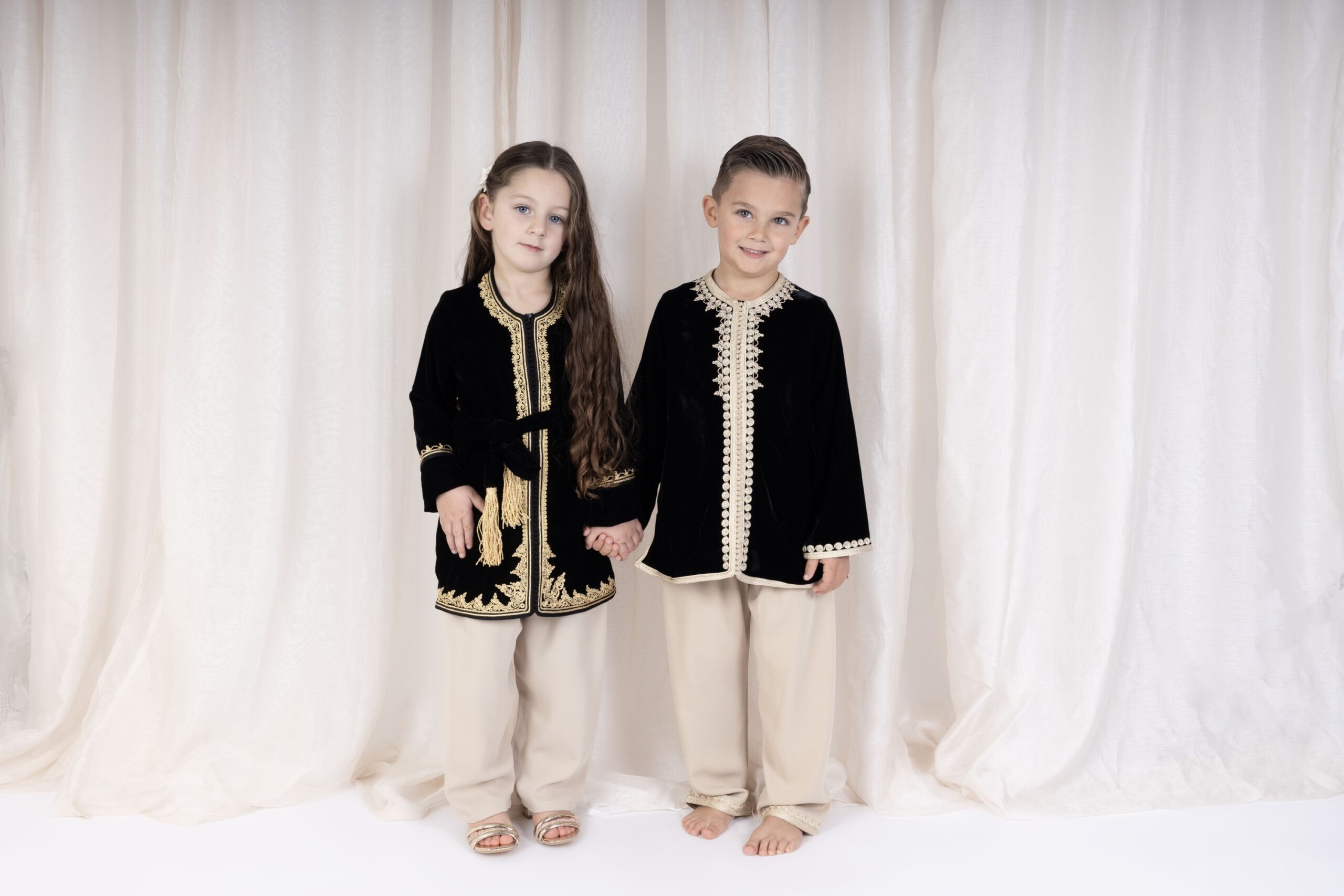 De rijke combinatie van zwart en crème geeft de set een luxe uitstraling zonder overheersend te zijn. Perfect voor Eid, henna, verjaardagen, fotoshoots of momenten waarop je jouw dochter net dat beetje extra wilt laten stralen.