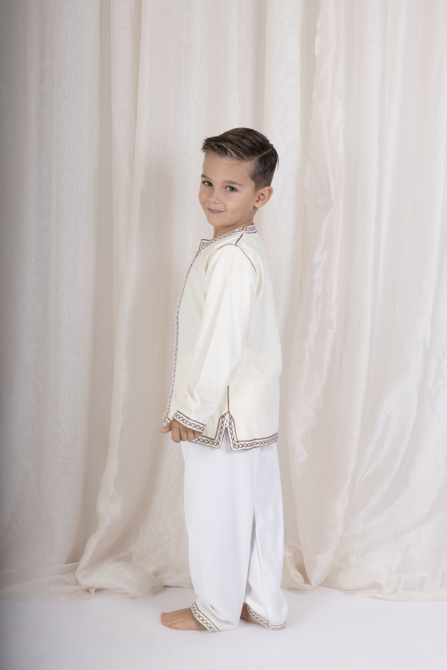 De jongens Jabador Set Karim Crème & Bruin is een elegante combinatie van een zachte mlifa cachemire top met een comfortabele crêpe broek. De top heeft verfijnde borduring in een warme bruine tint die mooi afsteekt tegen het crèmekleurige geheel. De broek valt licht en soepel, ideaal voor actieve jongens die toch netjes gekleed willen zijn.