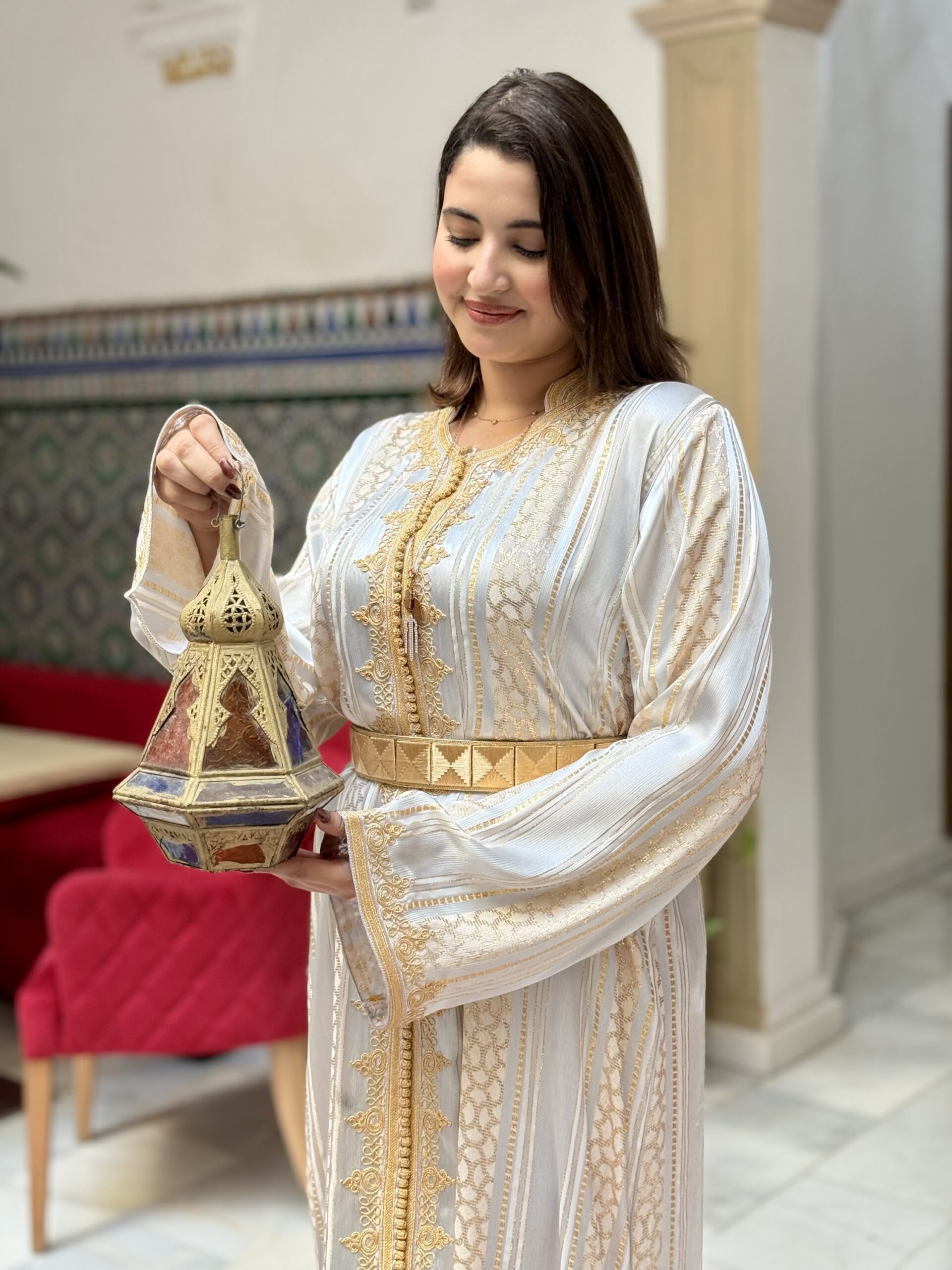 De meisjes caftan Jawhara Malak is speciaal ontworpen als perfecte match bij de damesversie. Gemaakt van dezelfde luxe jawhara stof met goudkleurige details die direct opvallen. De caftan heeft een mooie pasvorm en een zachte, glanzende uitstraling waardoor elk meisje zich een echte prinses voelt.