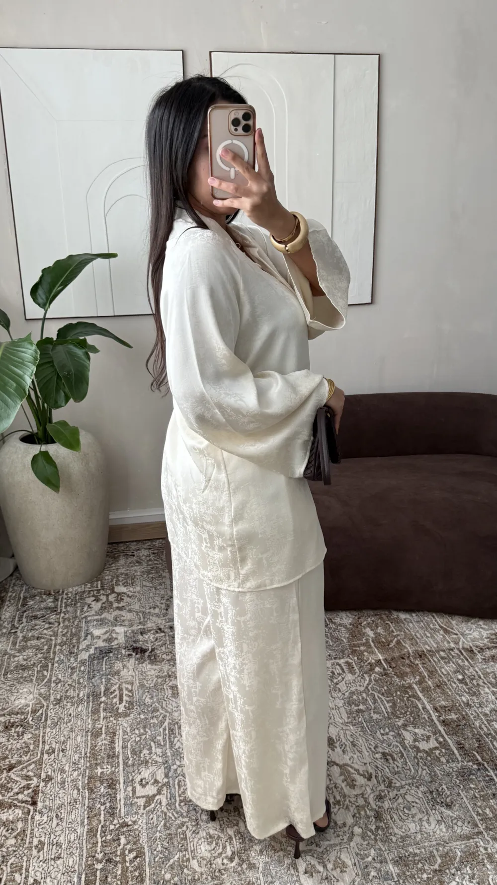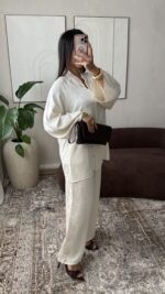 De Nayra Set Beige is een stijlvolle tweedelige dames set met een luxe en comfortabele uitstraling. De set bestaat uit een elegante top en een bijpassende broek, waardoor je direct een complete en trendy look hebt. De beige kleur zorgt voor een zachte, chique uitstraling en is makkelijk te combineren voor elk seizoen.
