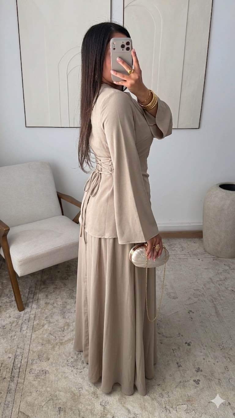 De Soraya Skirt Set Beige is een stijlvolle tweedelige dames set met een luxe en vrouwelijke uitstraling. De set bestaat uit een elegante top en een bijpassende rok, waardoor je direct een complete en chique look creëert. De beige kleur zorgt voor een zachte, tijdloze uitstraling en is perfect te combineren voor elk seizoen.